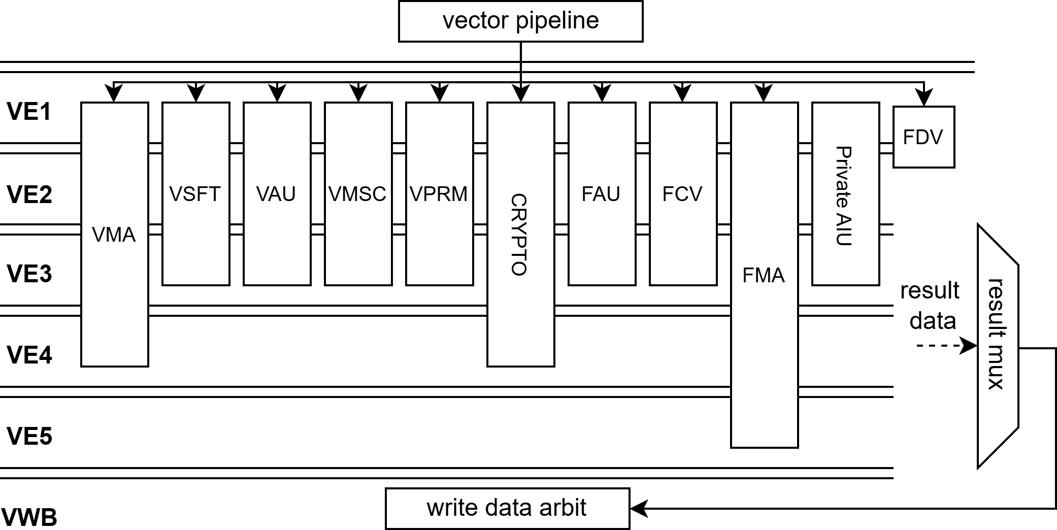 "The A100 Vector Unit is driven by two parallel vector pipelines that perform vector-instruction splitting, dependency handling, and vector register-file reads/writes, with results produced primarily in stages VE3–VE5."