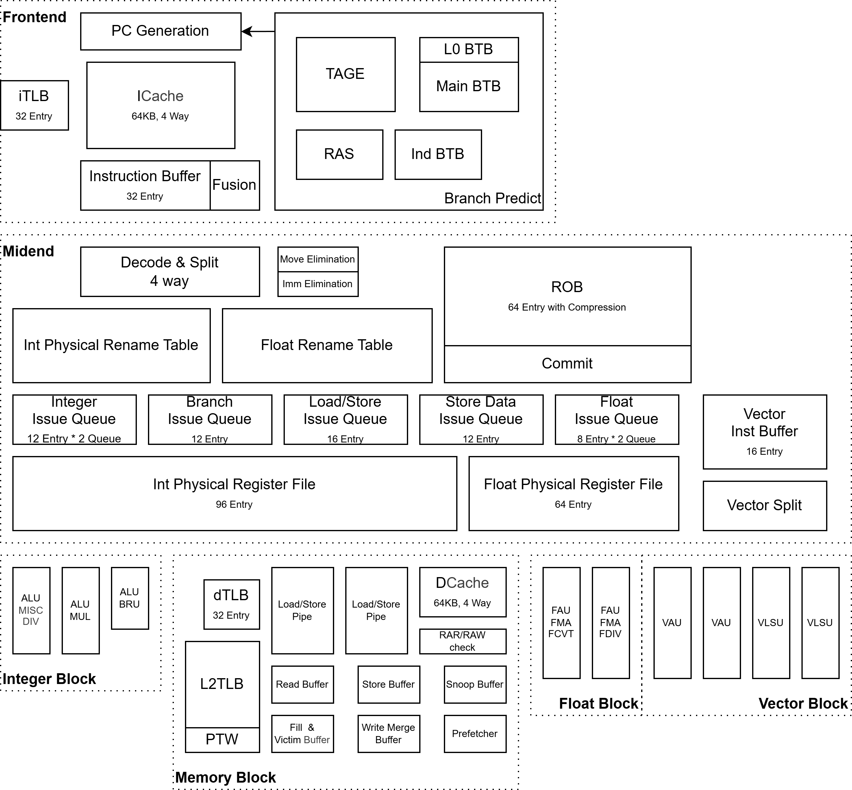 "The major improvements include: increasing frontend fetch bandwidth and improving branch prediction accuracy; widening decode and dispatch and leveraging multiple techniques to enhance execution efficiency; restructuring the load/store subsystem to increase memory bandwidth while substantially reducing access latency; adding a vector execution unit compliant with the RISC-V Vector Extension v1.0"